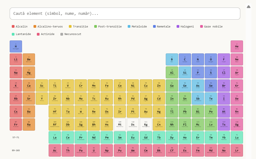 Crează o versiune interactivă a tabelului periodicPoți căuta elemente după nume sau poți atinge orice element pentru a afla mai multe despre el