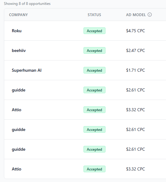 În Beehiiv, cu un abonament de 99$/lună și un pic peste 4000 de adrese de e-mail active, am generat aproximativ 1000$ luna aceasta, fără să fiu nevoit să vând ceva ca să nu aduc bani de acasă.