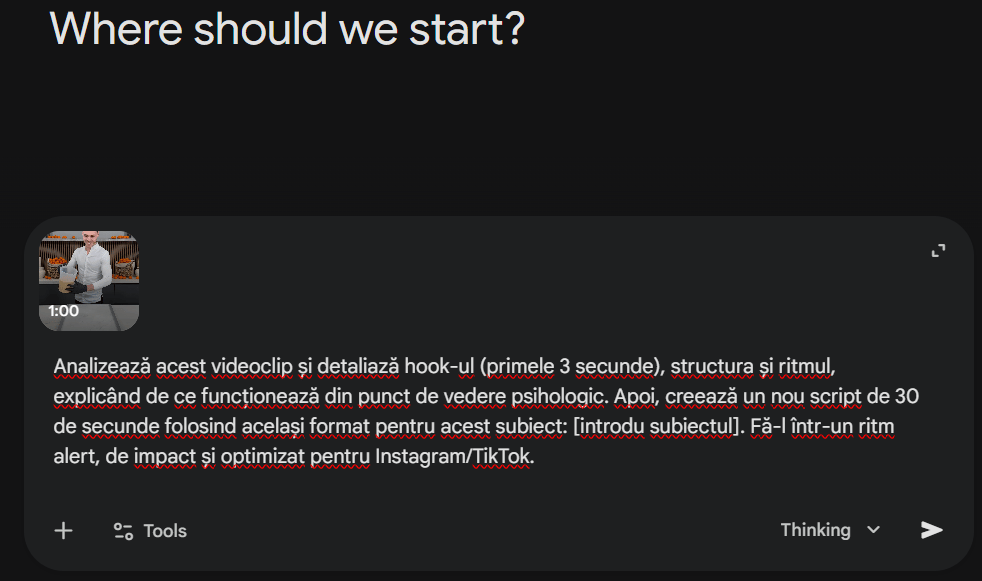 Roagă Gemini să analizeze videoclipul și să genereze un script de 30 de secunde ținând cont de hook, ritm și structură, folosind următorul prompt