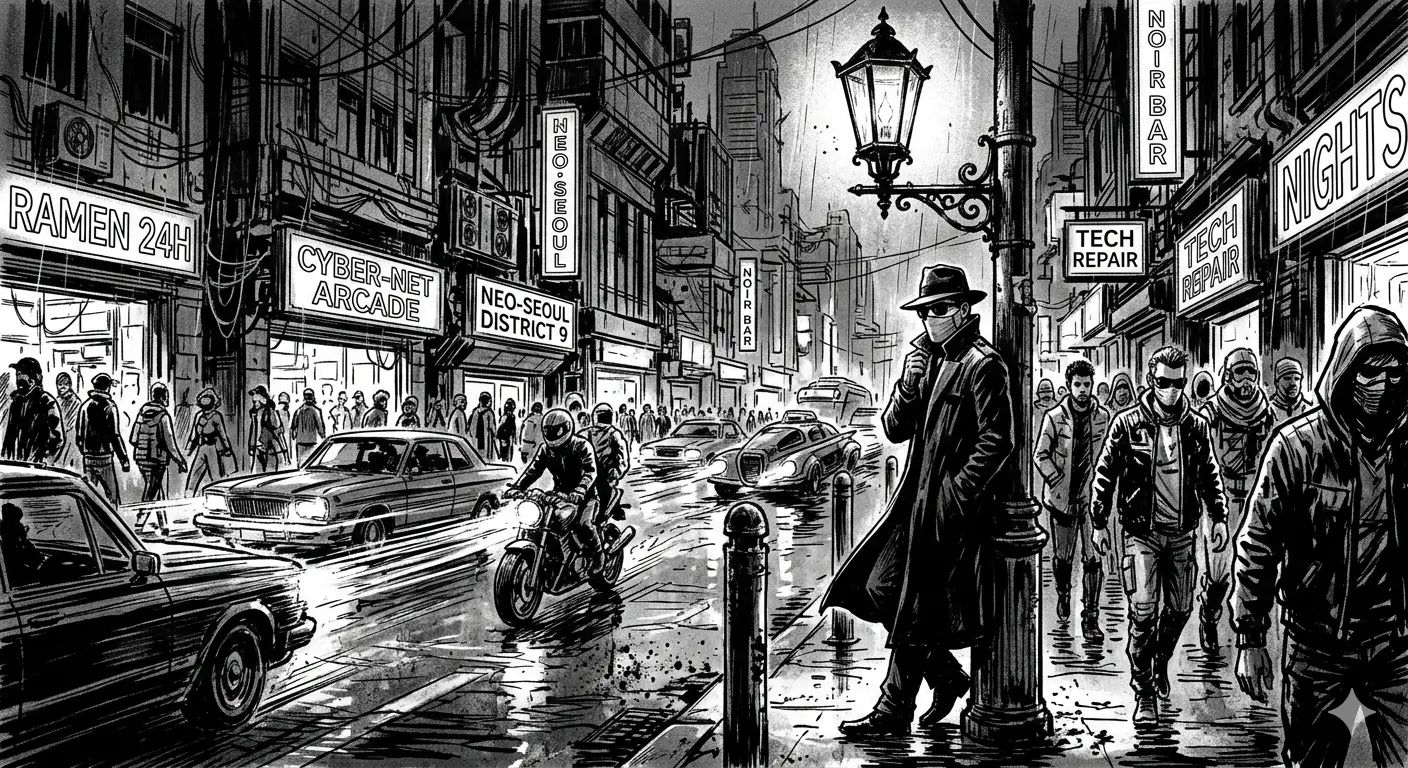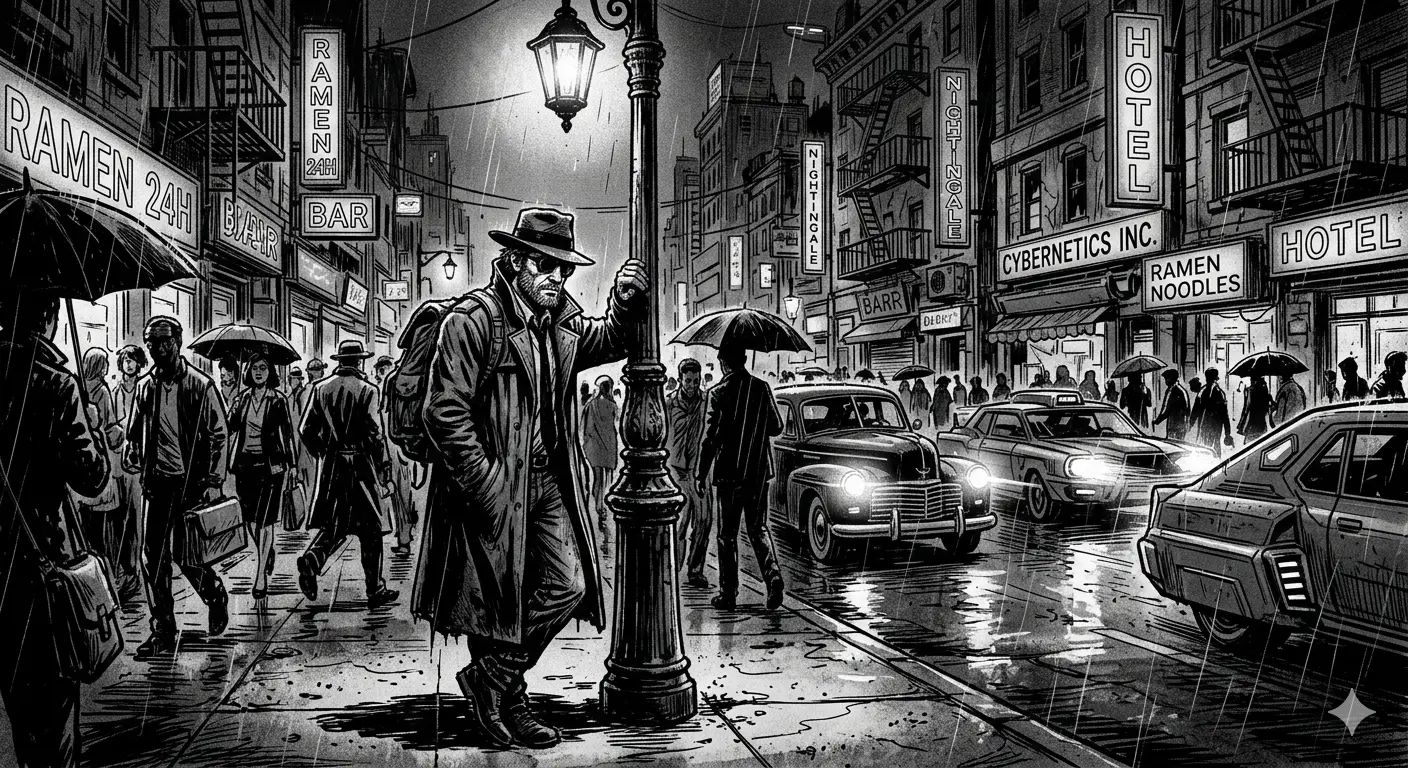 Creează o scenă în stil bandă desenată noir, cu un detectiv deghizat care stă pe o stradă aglomerată din oraș, noaptea, sub un felinar slab luminat.