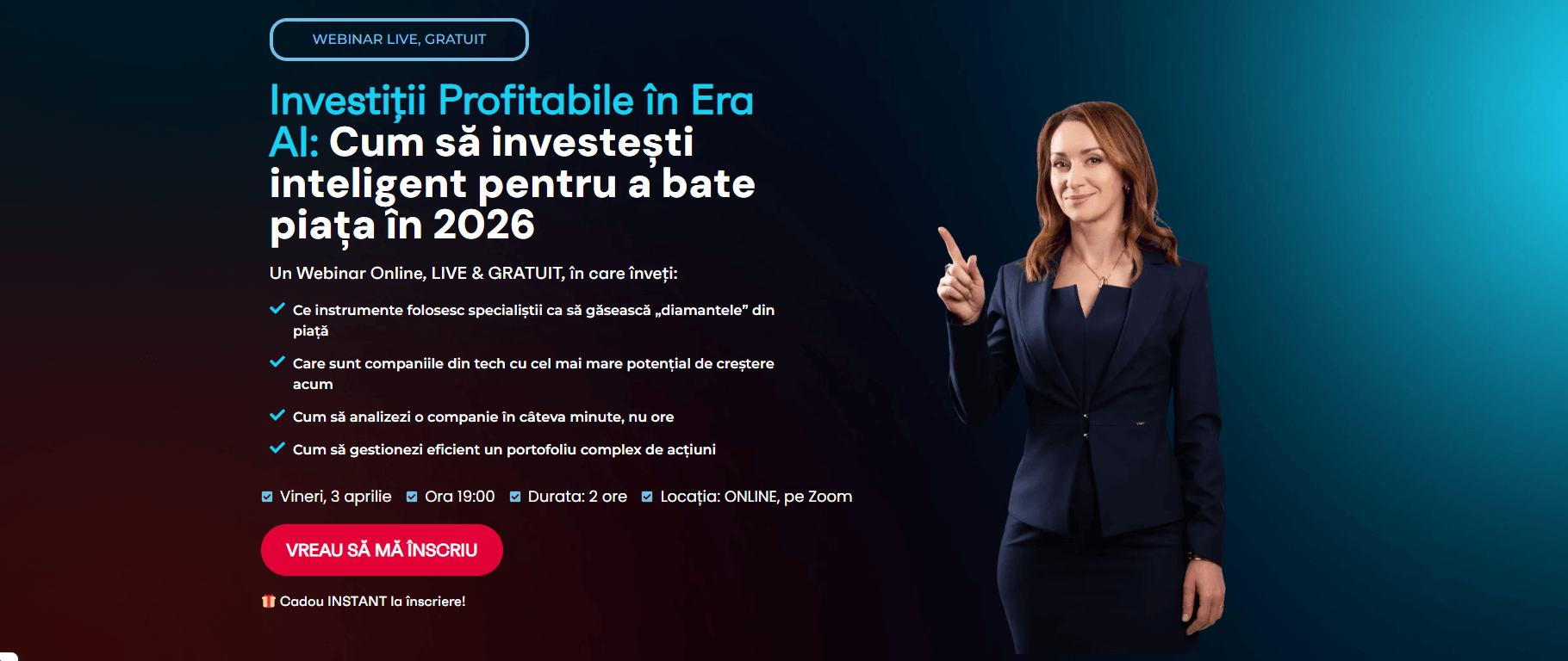 Mâine seară, Olga Ursu va susține Webinarul Gratuit “Investiții Profitabile în Era AI: Cum să investești inteligent pentru a bate piața în 2026”.