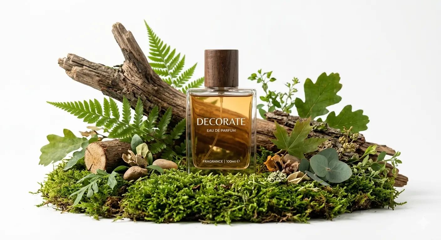 O sticlă de parfum cosmetic este așezată pe mușchi, înconjurată de lemn și frunze, cu numele brandului „decorate” scris pe ea cu litere albe.