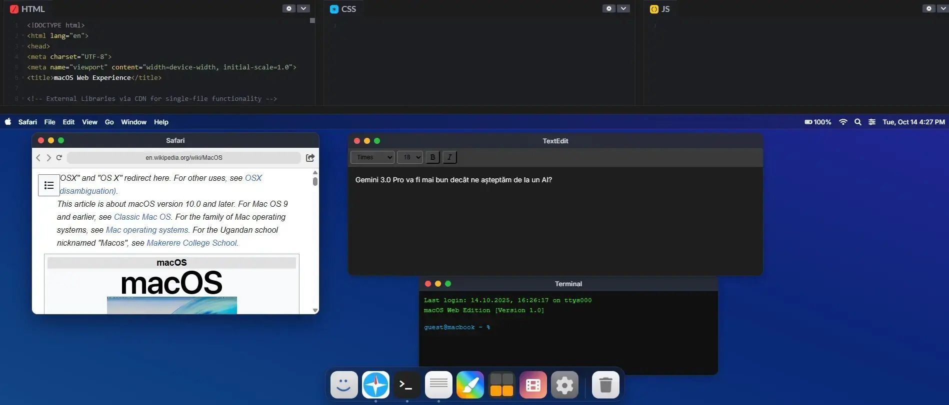 Rezultatul ar fi fost o replică foarte fidelă a interfeței macOS, cu animații, elemente funcționale și chiar browser integrat, tot generat “dintr-o singură încercare”.