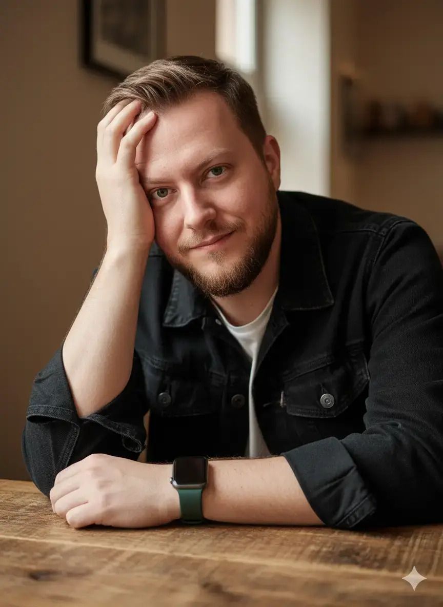 Keep my exact face and body features from the given picture. A hyper-realistic portrait of me sitting at a wooden table, leaning slightly forward with one arm resting on the table. I am wearing a black denim jacket with rolled-up sleeves, and inside the jacket, a white t-shirt. On my wrist, I have a smartwatch with a dark green strap. My head is tilted slightly, with one hand resting casually and comfortably on my forehead. My hair is styled, and I have a soft expression.