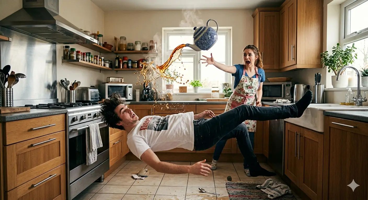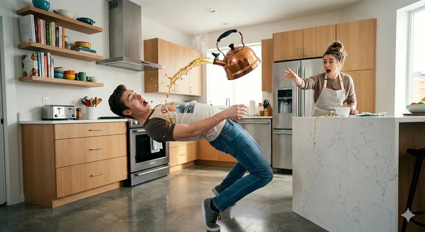 Scenă suprarealistă și comică într-o bucătărie modernă: un tânăr se apleacă pe spate într-o poziție extremă de evitare, acrobatică și exagerată, cu un ceainic suspendat în aer deasupra lui, vărsând ceai fierbinte într-un moment dramatic înghețat.